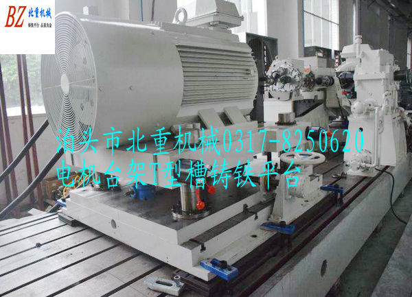 電機臺架T型槽鑄鐵平臺,T型槽鑄鐵平板工作面都加工有T型槽,中間距為200mm,一般用28t型螺絲,精度為2級。這樣的設計就是為了把電機定位在鑄鐵平臺上面,轉起來(lái)試驗,要得到數據等!